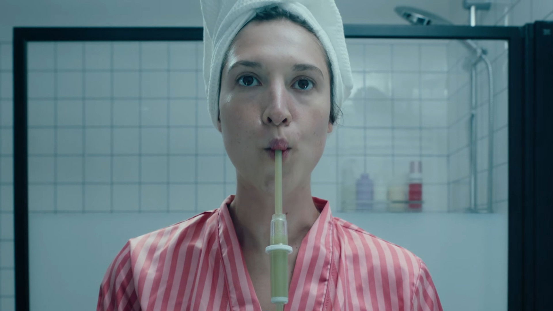 In the mirror, a woman takes care of herself.