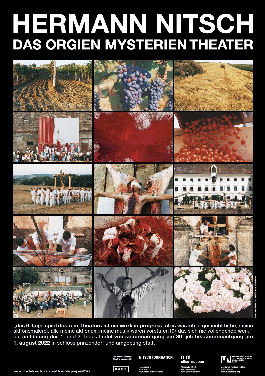 Nitsch's work, which can be considered both ritualistic and existential, first drew attention in the early 1960s when he exhibited a skinned and mutilated lamb. The lamb was crucified against a white fabric-covered wall, with the entrails removed and displayed below a white table, splashed with blood and hot water. Currently his work is often discussed in the context of our cultures fixation with violence seen on the news, movie screens, and in popular video games. Correlations have also been drawn to many instances of the intersection of violence and culture. These performance works, which have become known as "actions" have become more and more elaborate over the years.