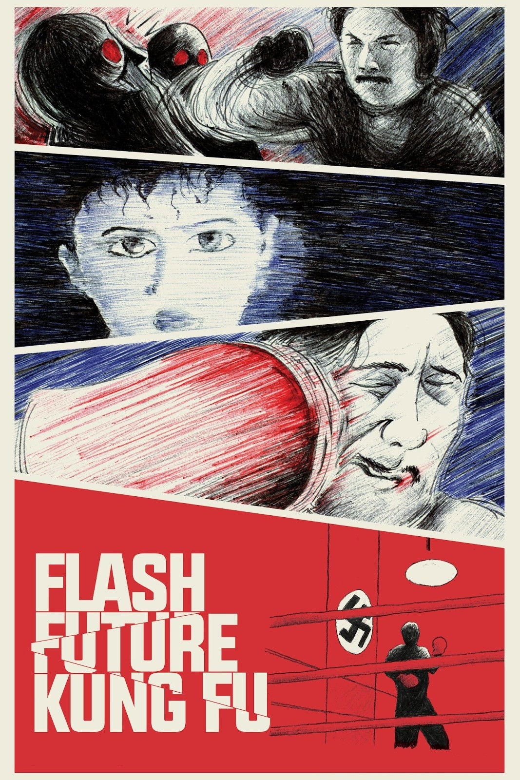 Imagine an old-school martial arts melodrama about competing fighting schools dropped into the grungy sci-fi world of Blade Runner, and you have an idea of the curious mix of styles in Flash Future Kung Fu. Eddy Ko is the maverick star pupil of an honorable school who secretly engages in underground "Black Boxing" bouts, a black market sport off limits to the school. The ambitious X-Gang, a bloodthirsty neo-Nazi-like organization, plots to take care of Ko and his friends and take over the city with their army of mind-controlled zombie soldiers. In true Hong Kong fashion, it boils down to a showdown of champions, and this one takes place in a boxing ring in an eerily empty warehouse with video coverage broadcasting the event all over.