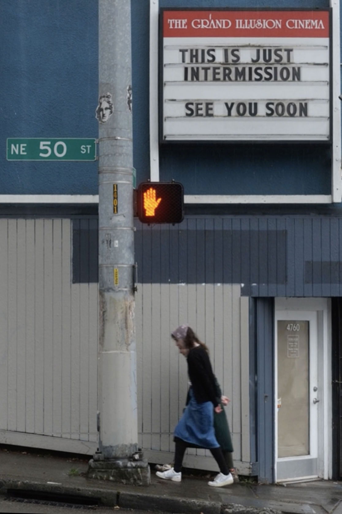Two women perform a religious service outside of a movie theater.