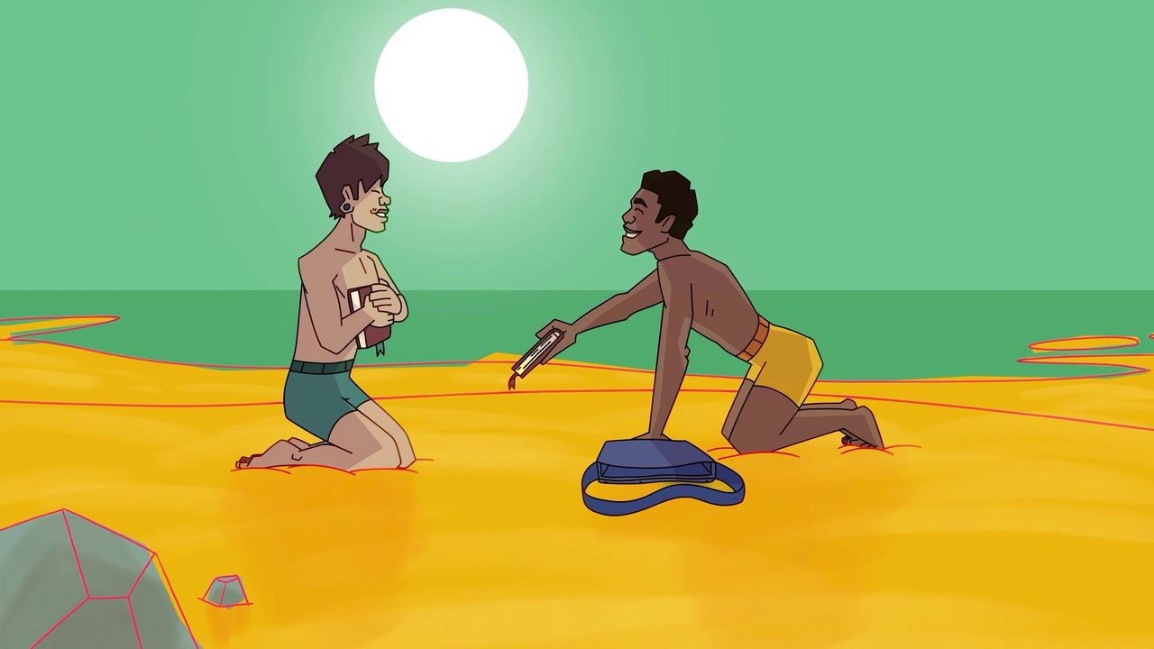 The jewel-toned animation of queer teenage love is chronicled by guitar-playing mermen and the vocals of AJ Rafael and Chance Calloway. This is a love story illustrating the kind of connection without stigma or trauma that queer teens deserve.