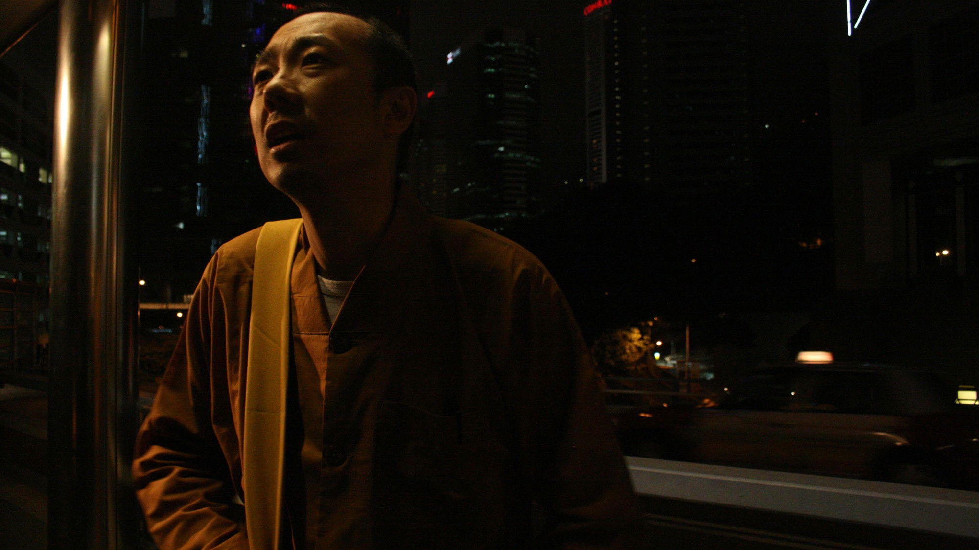 In the prosperous city, a monk wearing a brownish-yellow Buddhist gown begs for alms and blesses passers-by with a smile. After bring moved on by the police, after concerns voiced by a production unit, and after an encounter with an old woman who gives him alms, he begins to ask himself: Who am I really?