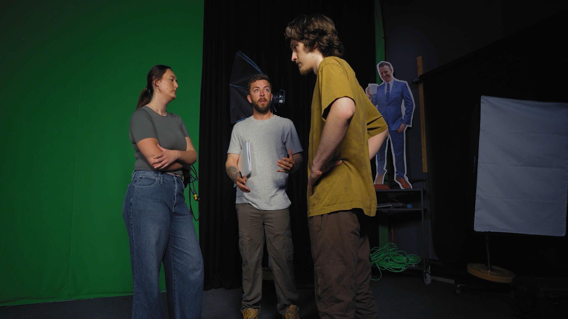 When an egotistical TV host storms off the set 10 minutes before airtime, the discarded crew tapes a cardboard cutout to his chair-igniting a surreal media frenzy and triggering his desperate bid to reclaim the spotlight.