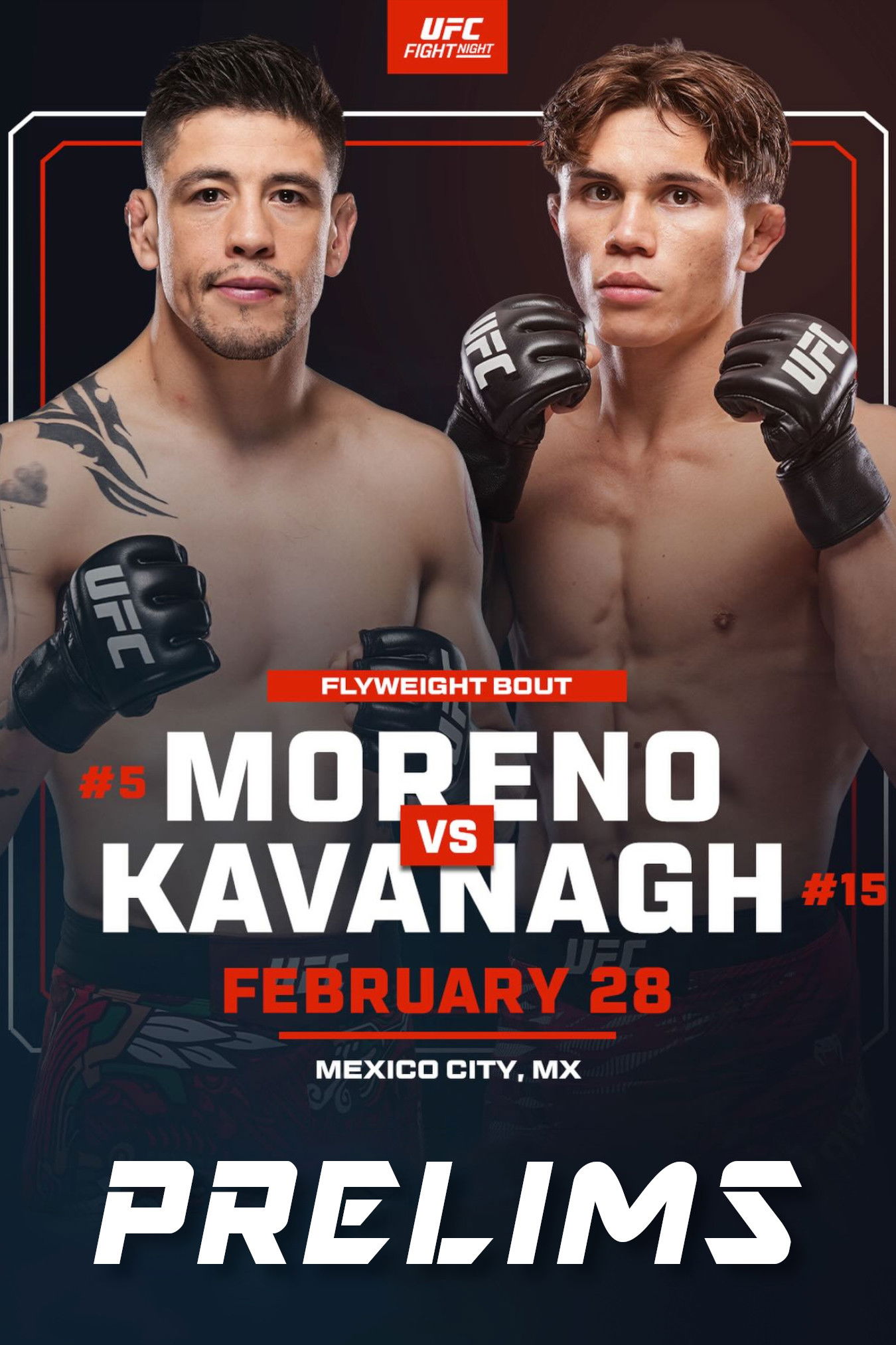 UFC Fight Night: Moreno vs. Kavanagh (also known as UFC Fight Night 268) was a mixed martial arts event produced by the Ultimate Fighting Championship that took place on February 28, 2026, at the Arena CDMX in Mexico City, Mexico. A flyweight bout between former two-time UFC Flyweight Champion Brandon Moreno (also former LFA Flyweight Champion) and Asu Almabayev was scheduled to headline the event. However, Almabayev withdrew due to a hand injury and was replaced by Lone'er Kavanagh.