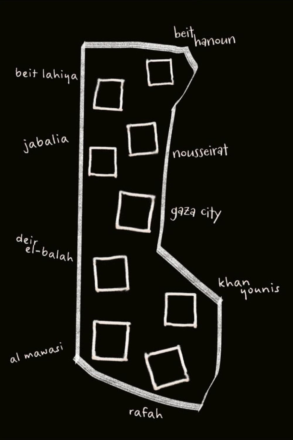 A map of Gaza, its towns, camps and neighbourhoods. White paint on a black ground. Within the crudely drawn outlines, nine refugees who escaped the inferno tell their stories.